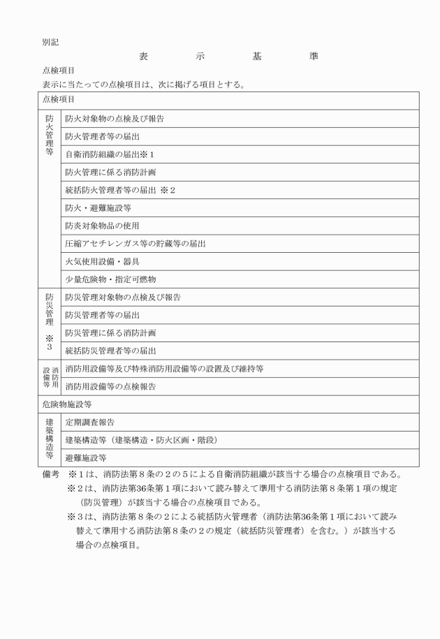2 表示基準の審査においては、消防法に定める防火対象物定期点検報告、防災管理定期点検報告、消防用設備等点検報告及び製造所等定期点検記録表並びに建築基準法に定める定期調査報告等の制度を活用し行うものとする。